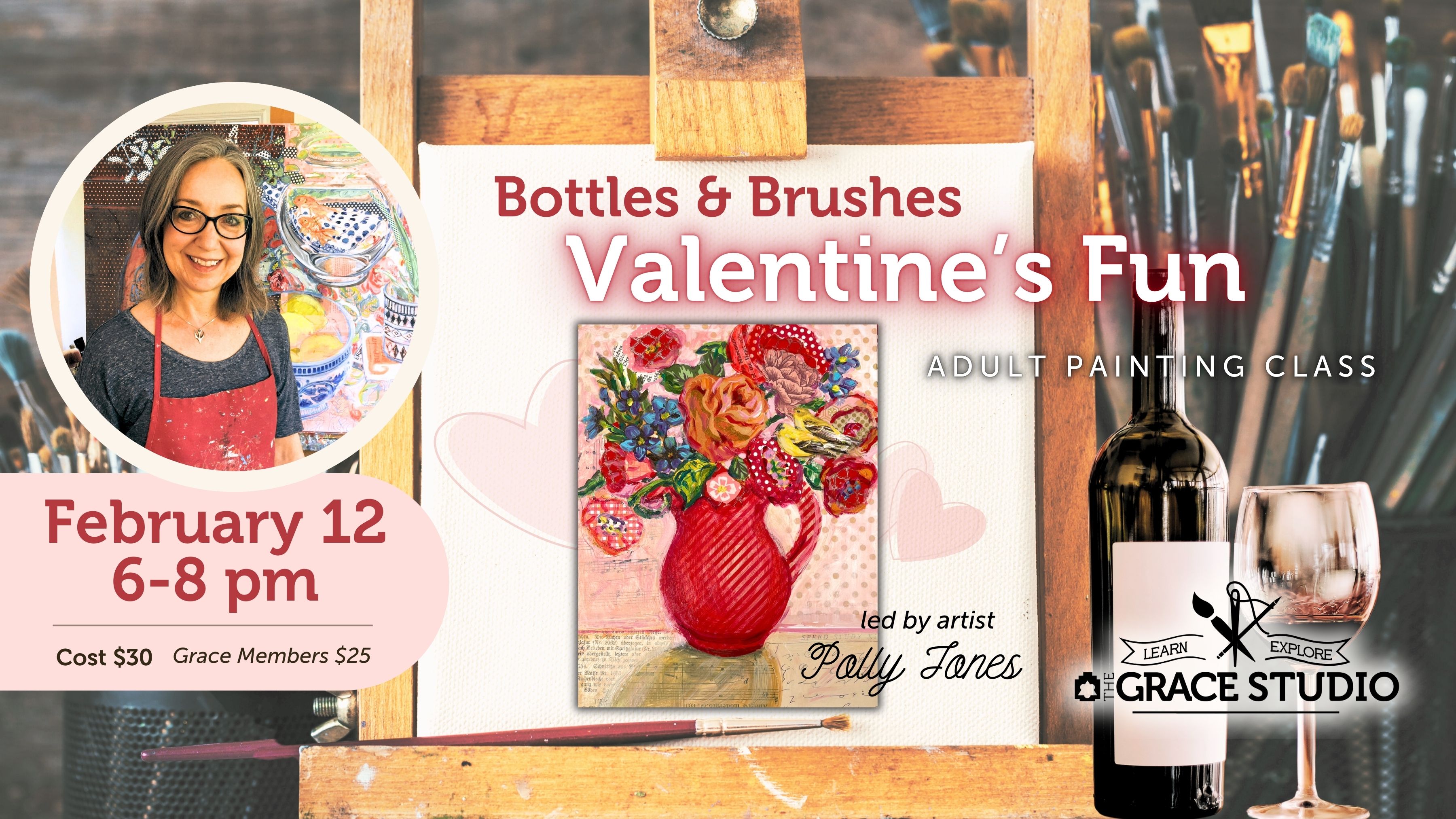 Enjoy some Valentine's painting fun! Don't miss this fun, Valentine-themed, 𝙗𝙚𝙜𝙞𝙣𝙣𝙚𝙧 𝙛𝙧𝙞𝙚𝙣𝙙𝙡𝙮 painting class! Local artist Polly Jones will guide you through the process of creating a beautiful flower painting in her signature style of combining bold colors and interesting patterns. Bottles & Brushes classes are the perfect way to get creative with your friends. BYOB (if you wish) and ... Bottles & Brushes: Valentine’s Fun