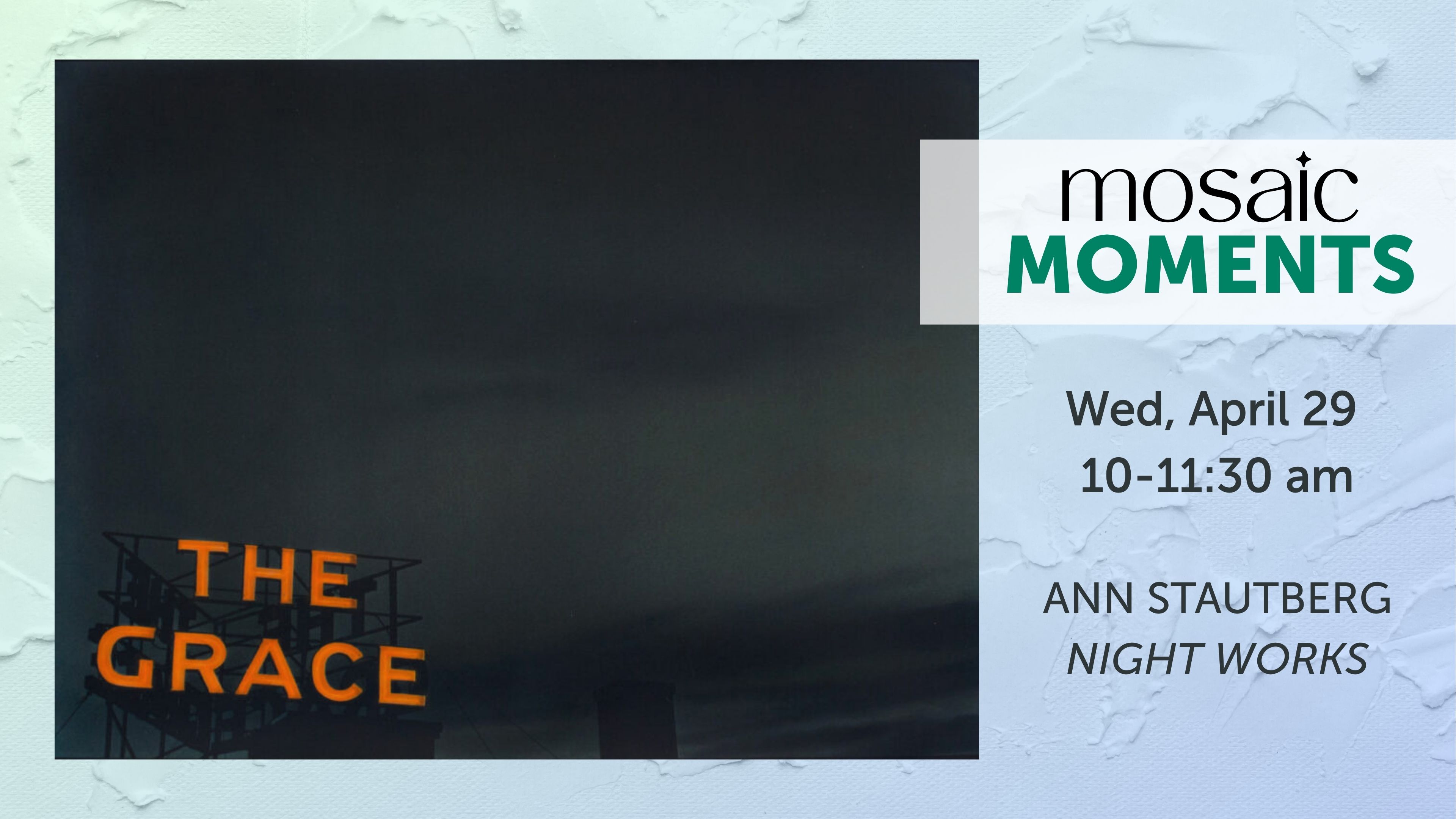 A creative opportunity for senior adults FREE for Grace Members and with regular Museum Admission This month will focus on the work of Ann Stautberg. Attendees will share memories based on her photographs and engage with an activity. Mosaic Moments is a special time for senior adults to spend time in our art and history galleries engaging their minds and ... Mosaic Moments |