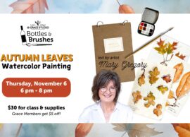 Enjoy a beginner-friendly painting class! Learn basic watercolor mixing and painting techniques from local artist, Mary Gregory. Attendees will receive step-by-step instructions and will practice painting autumn leaves in a keepsake journal. At the end of class, you will get to take home your journal as well as a travel-sized watercolor paint tin so you can keep practicing! Bottles & … Bottles & Brushes: Autumn Leaves